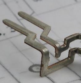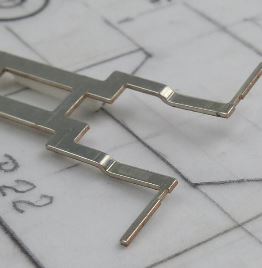 Wir stellen Elektrische Kontakte für Automotive und Elektronik her. Vormaterial ist z.B. CuSn6 mit galvanisch verzinnter Oberfläche. Kleinste Prägungen und Biegungen werden im Folgeverbundwerkzeugen realisiert.